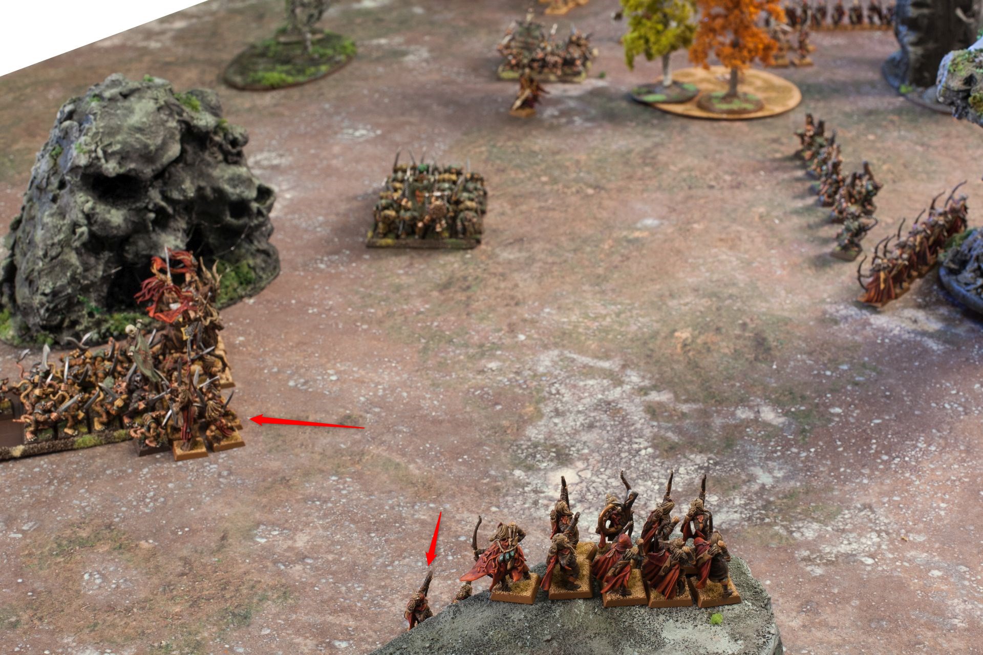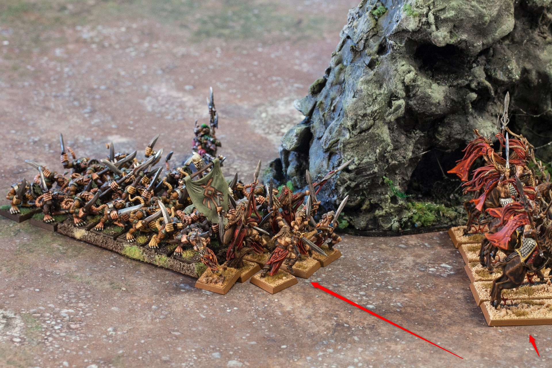 The Clanrats on the Skaven right flank circled around the rock of skulls, leaving a tiny gap for the Endineer to cast his deadly spells against Karodras.